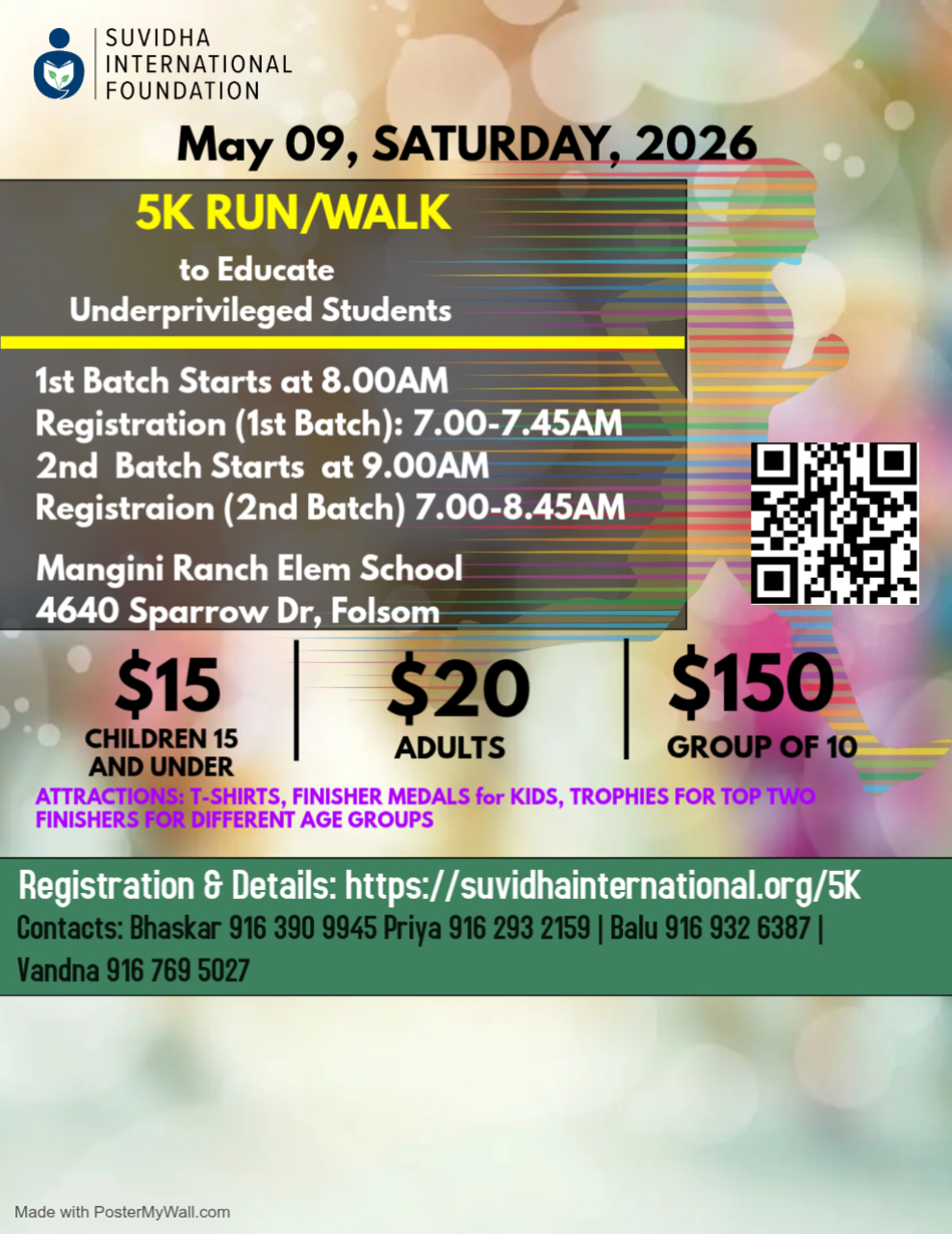 Suvidha International Foundation, a California-based 501(c)(3) nonprofit organization, is organizing our annual 5K Walk/Run in Folsom, Sacramento in on Saturday, May 9th and a virtual walk/run in other cities part of US and other countries from May 1st to May 30th to support underprivileged students. By participating, the participants will not only enjoy a fun run but also contribute to a noble cause. Every step the participants take will help provide education and opportunities for those in need.