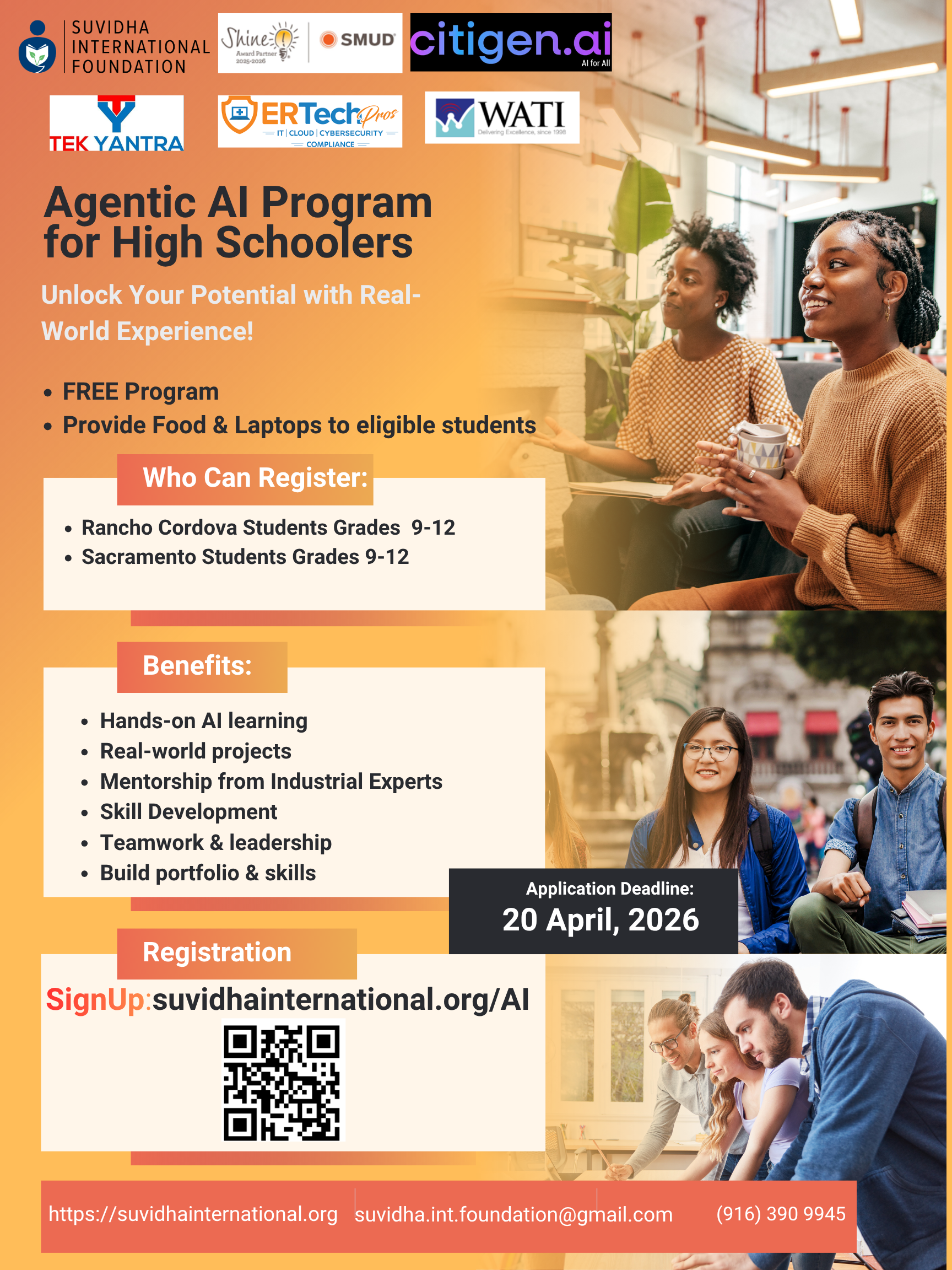 In partnership with the SMUD, Suvidha International Foundation is conducting Afterschool Agentic AI Program for High Schoolers. The program is offered at two locations including at Cordova High School and a Sacramento location. This program is designed to teach high school students about artificial intelligence (AI) and AI agent development while solving real-world industry problems. It will benefit