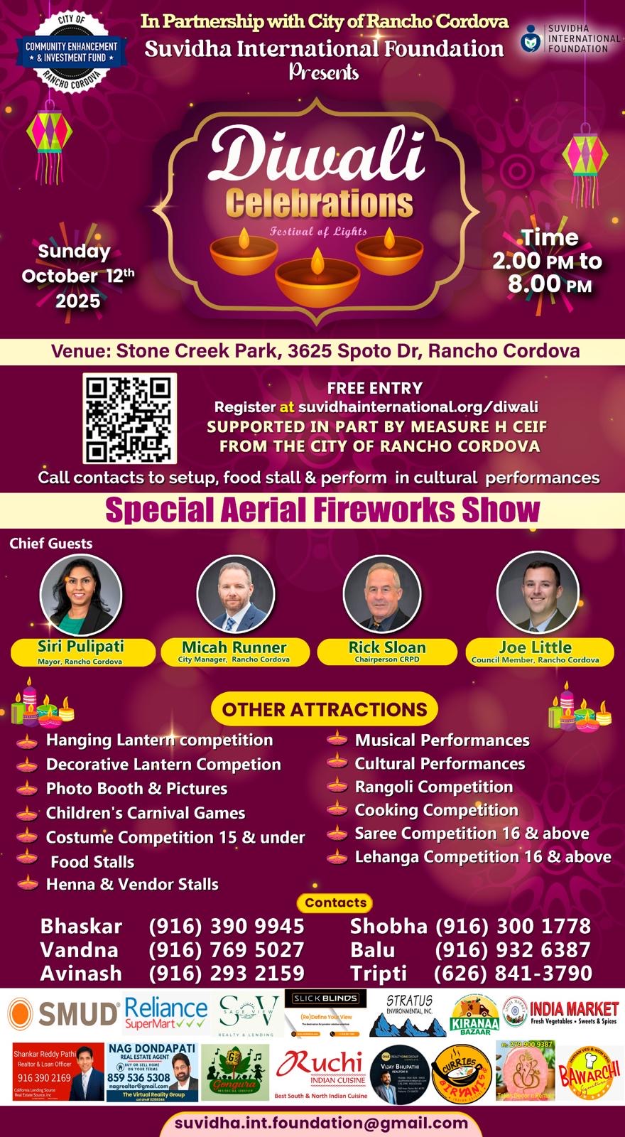 In partnership with City of Rancho Cordova, Suvidha International Foundation is organizing a vibrant and culturally enriching celebration of Diwali in the City of Rancho Cordova. Diwali is one of the most significant festivals in India and is celebrated by millions of people around the world, including a growing community here in Rancho Cordova. It symbolizes the victory of light over darkness and good over evil, and it brings together people from diverse backgrounds to celebrate unity and prosperity.
