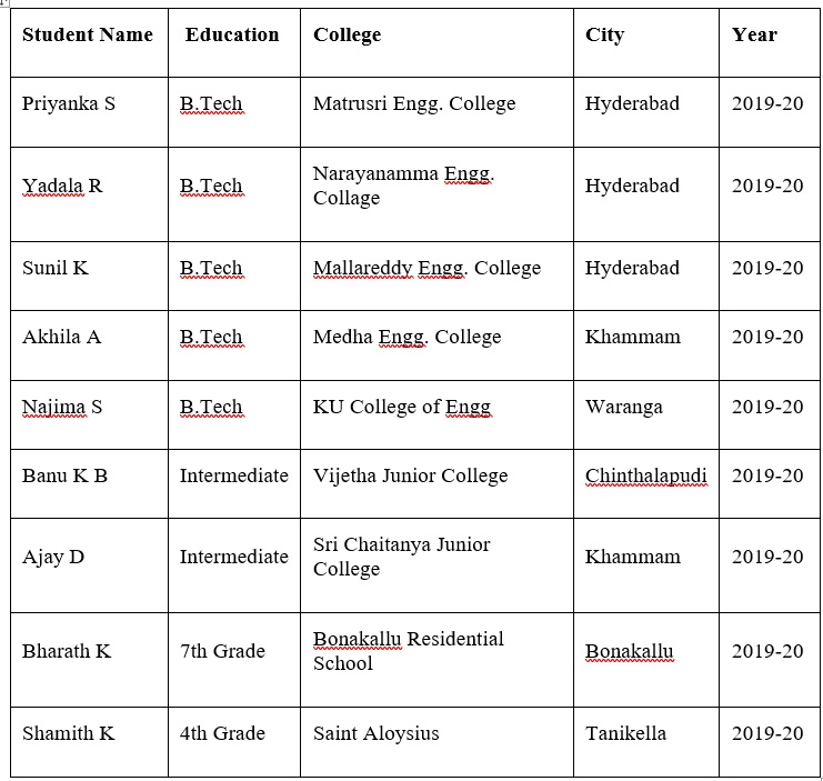As part of its mission to empower underprivileged yet deserving students, Suvidha International Foundation awarded financial scholarships to 11 students pursuing education at various academic levels, including high school, intermediate (junior college), and engineering programs. The scholarship amounts ranged from $100 to $1000. Each scholarship was tailored to meet the specific educational needs and financial circumstances of the student.