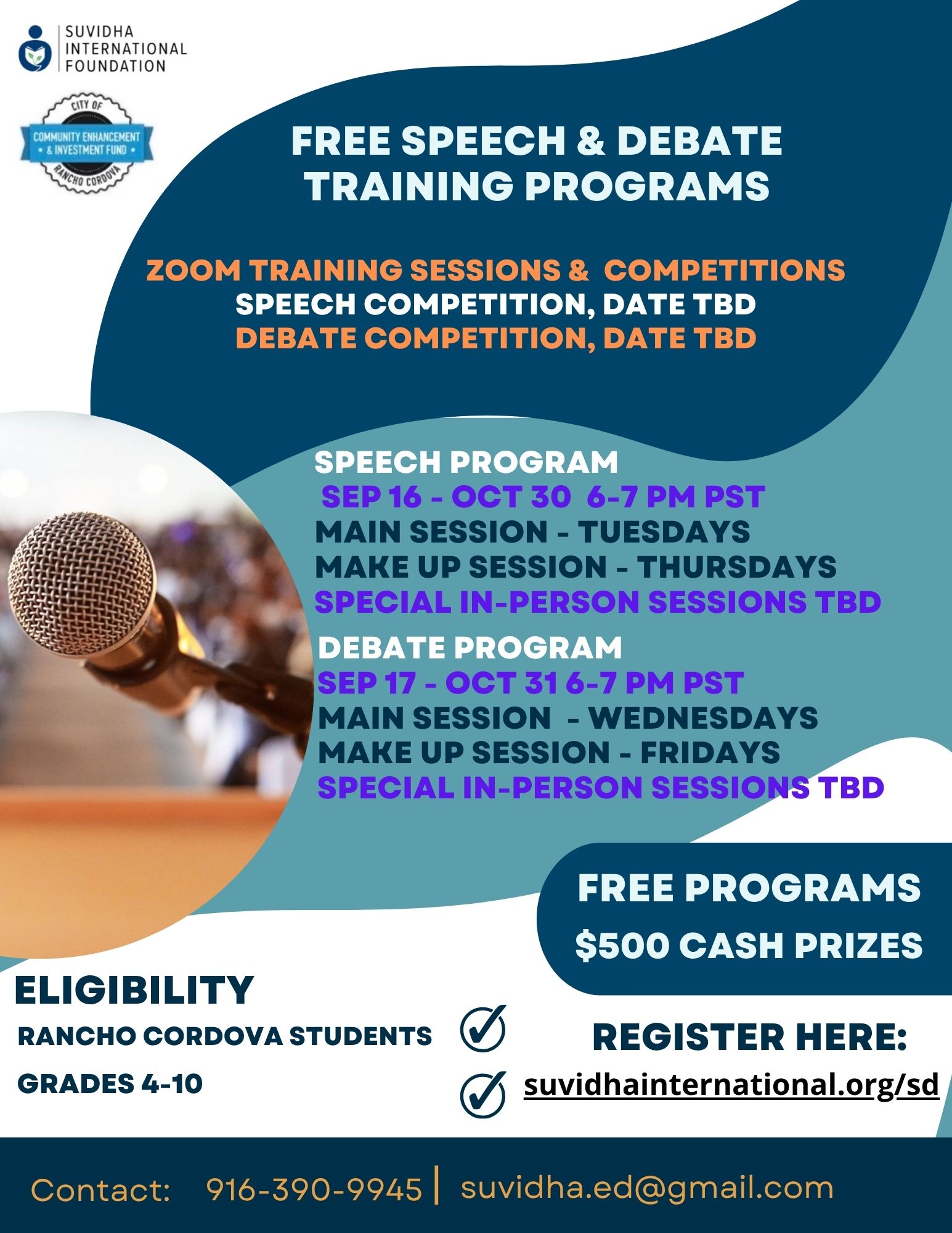 In partnership with the City of Rancho Cordova, Suvidha International Foundation, a California registered non-profit, is conducting speech and debate programs over zoom for Grades 4th through 10th.