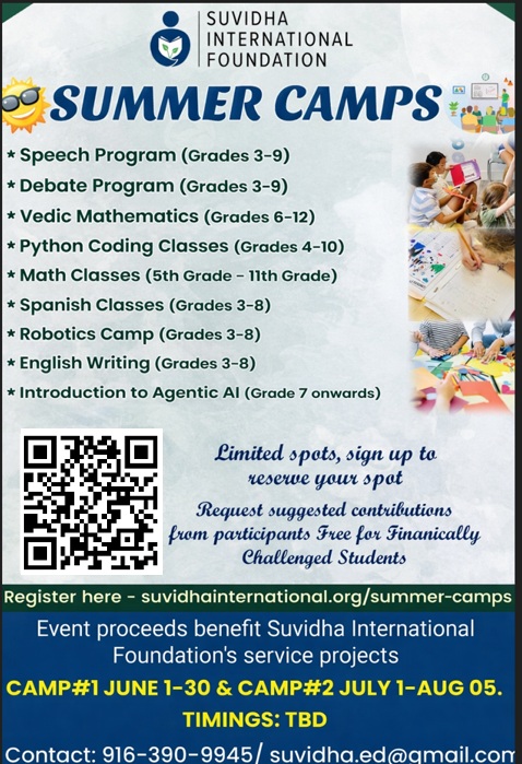 Suvidha International Foundation organizes a wide variety of educational programs, including Speech and Debate Programs, Python Coding class, Introduction to Agentic AI, Spike Prime Robotics Camp, Raspberry Programing, Introductory Spanish sessions, English Writing and an extensive range of Mathematics courses encompassing IM1, IM2, IM3, PreCalculus, Calcs AB, and Vedic Mathematics in Summer 2026.