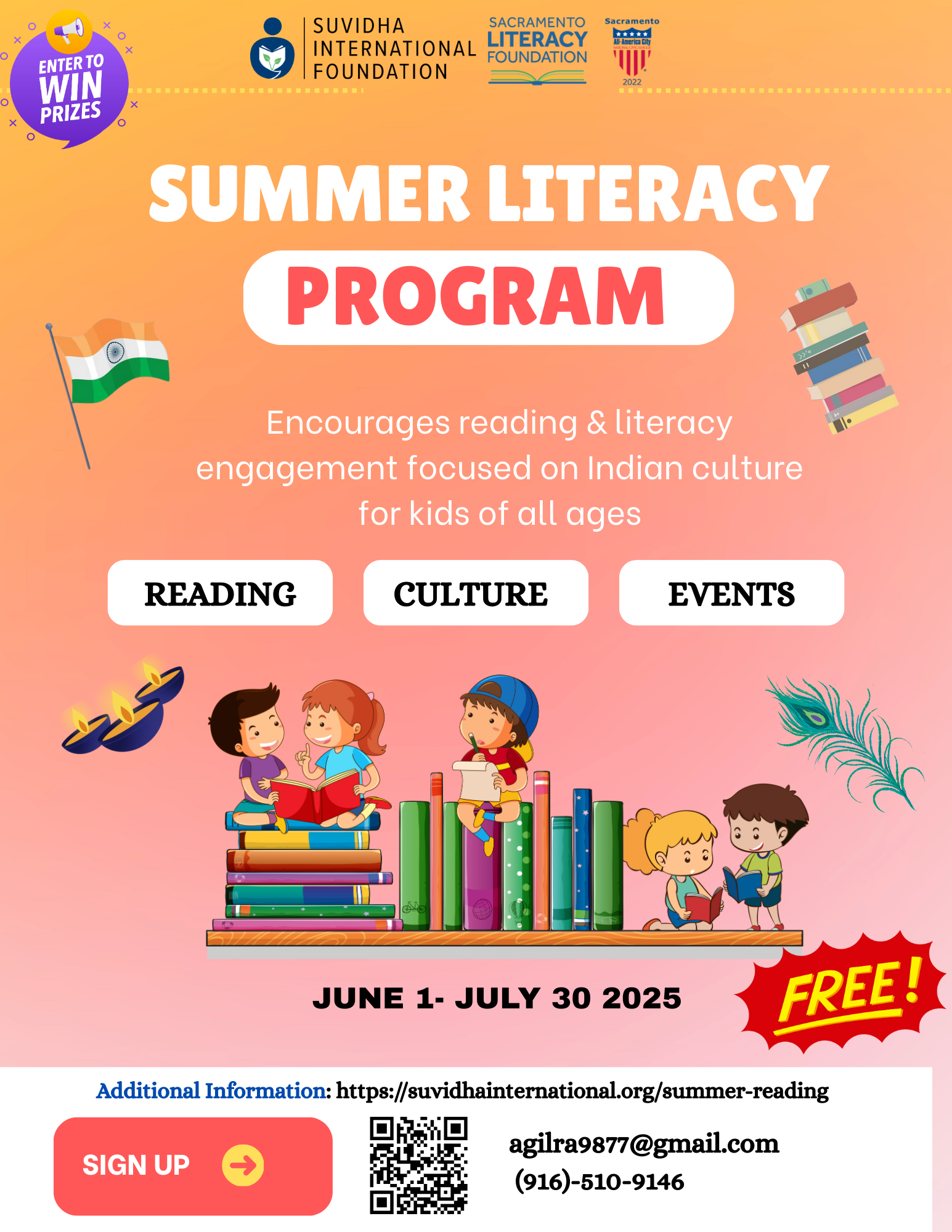 Suvidha International Foundation, in partnership with the Sacramento Literacy Foundation, is excited to launch a Summer Reading Program focused on Indian culture for students from Kindergarten to 5th grade!